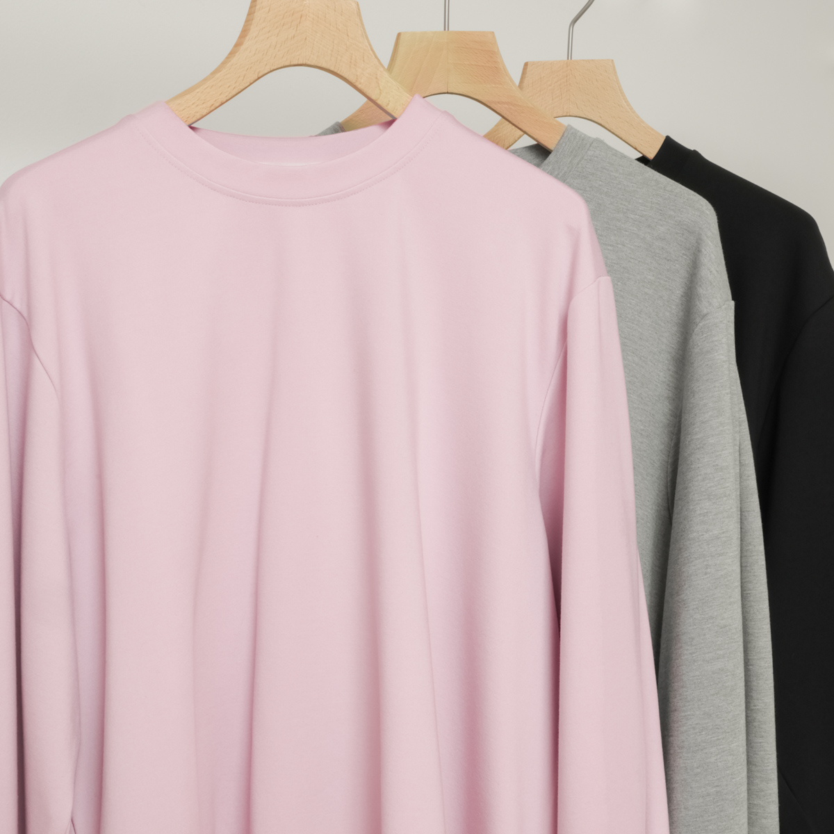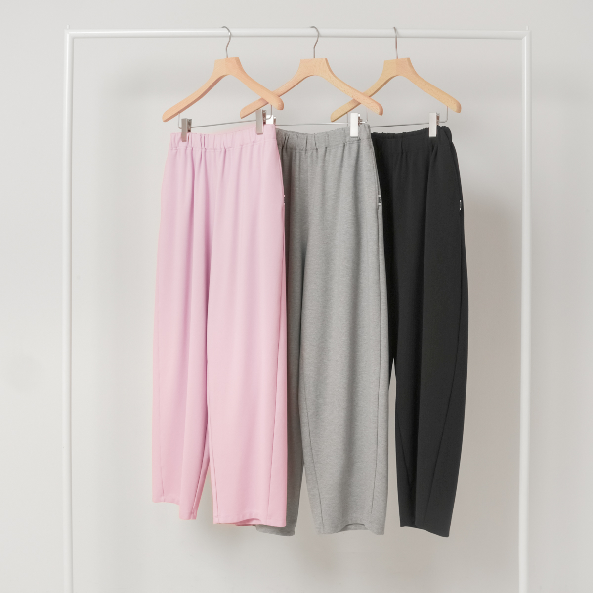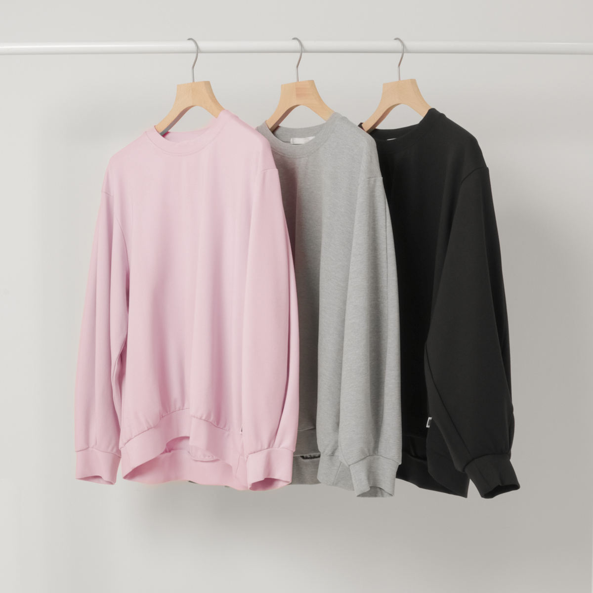 弾力のある上質なポンチ素材を使用。一般的な裏毛スウェットよりも光沢感がありカジュアルになりすぎない上品な印象。とろけるようなパウダリータッチな肌触りも魅力。UV CUT効果も備え、これからの季節にも取り入れやすい素材感です。カラーはやわらかな印象でスタイリングのアクセントになるピンク、着回しやすいベーシックカラーのトップグレーとブラックの3色展開。カジュアルにはもちろん、きれいめなコーディネートにも取り入れやすく、幅広いスタイリングに活躍するシリーズです。