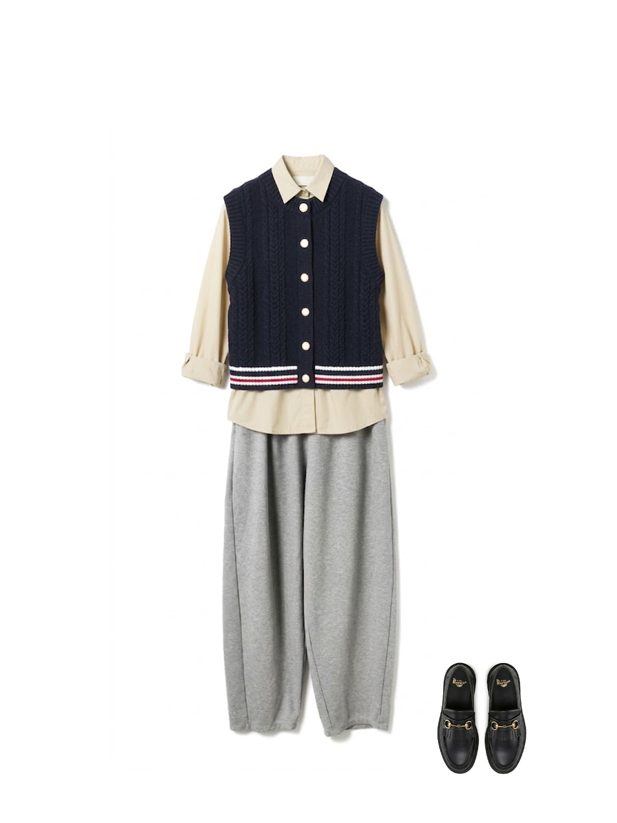 FILAニットベストにレクタングルシャツを重ね、グレーのコクーンジャージパンツを合わせたレトロなムードのスタイリング。ニットとシャツの異素材レイヤードが着こなしに奥行きをプラスし、シンプルなグレーボトムスが全体をスッキリとまとめます。ゴールドビットが効いたDr.Martensのローファーが足元に品格を添え、カジュアルの中に大人らしさが漂う春のコーディネートです。