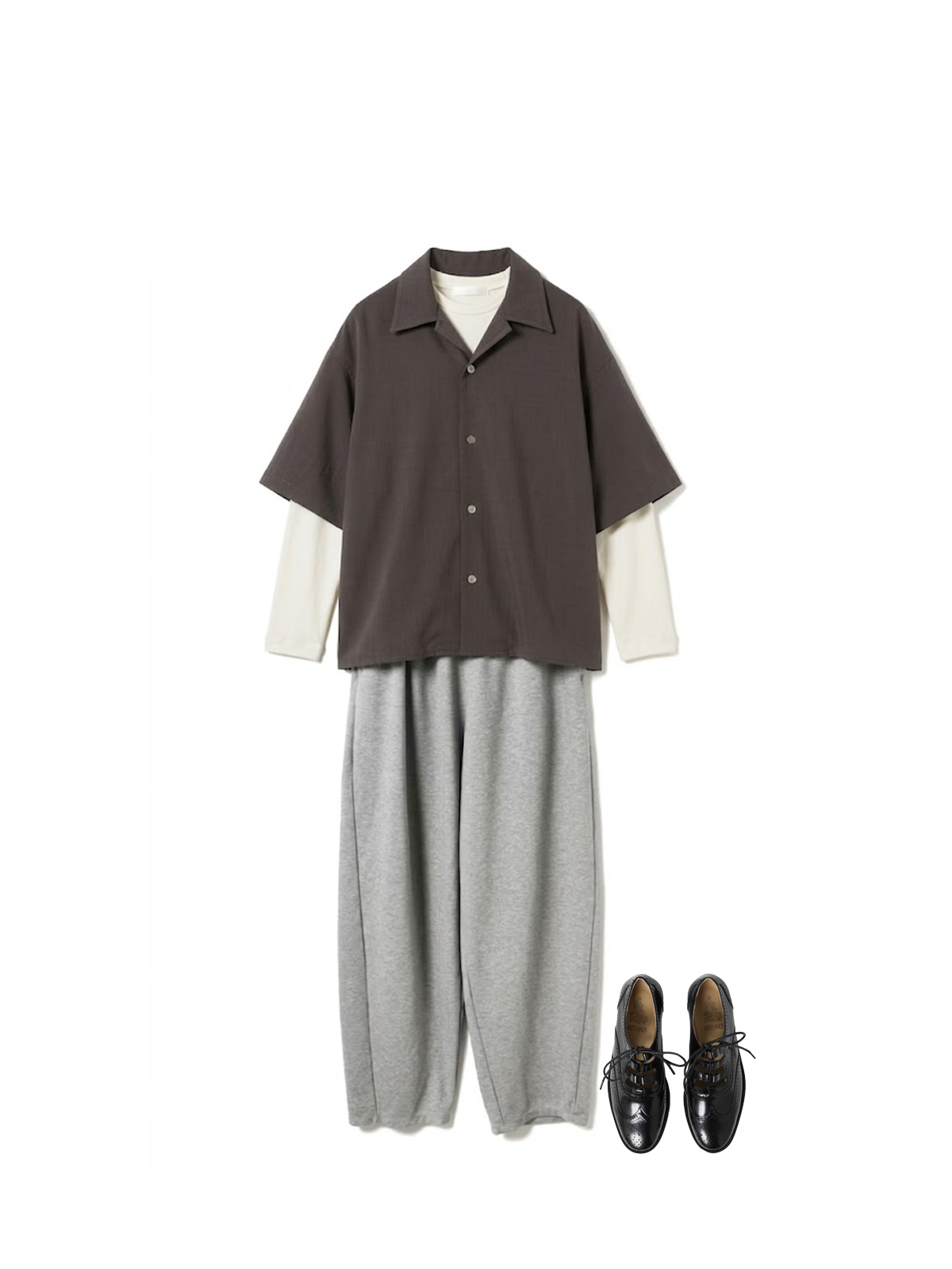 オープンカラーシャツにロングスリーブリブTシャツをインナーとして重ね、グレーのコクーンジャージパンツを合わせたリラックス感ある春スタイル。開衿から覗くリブTがレイヤードのアクセントとなり、程よいボリューム感のコクーンシルエットとのバランスが絶妙。ARTESANOSのカットワークレースアップシューズが足元に抜け感をプラスした、大人のカジュアルコーディネートです。