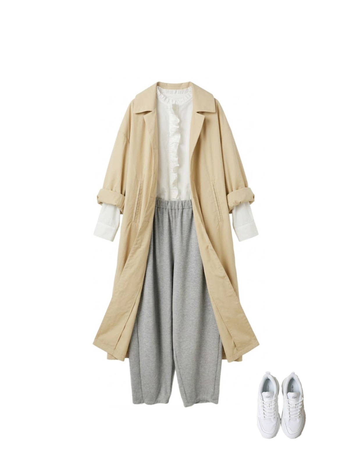 スプリングコートにレースショートプルオーバーを合わせ、グレーのコクーンジャージパンツでまとめたスタイル。ボリュームのあるスリーブが印象的なコートにレースの繊細な素材感が絶妙なコントラストを生み出し、春らしい軽やかな着こなしに。LACOSTEの白スニーカーが清潔感をプラスし、全体をさわやかに仕上げた大人のリラックスコーディネートです。