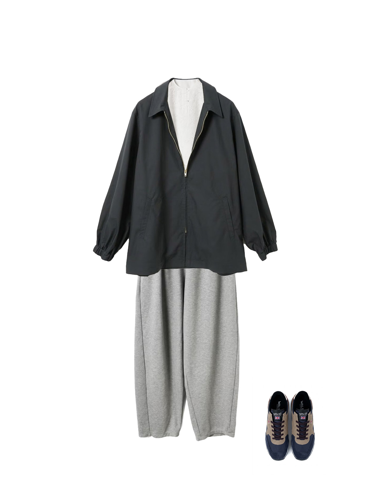 レースショートプルオーバーにブルゾンを合わせ、グレーのコクーンジャージパンツで仕上げた、甘さとカジュアルのバランスが絶妙なスタイリング。レースの繊細なデザインがスウェットパンツのリラックス感と好対照をなし、着こなしに女性らしさを演出します。WALSH スニーカーがこなれた抜け感をプラスし、春の休日にぴったりの大人コーディネートです。