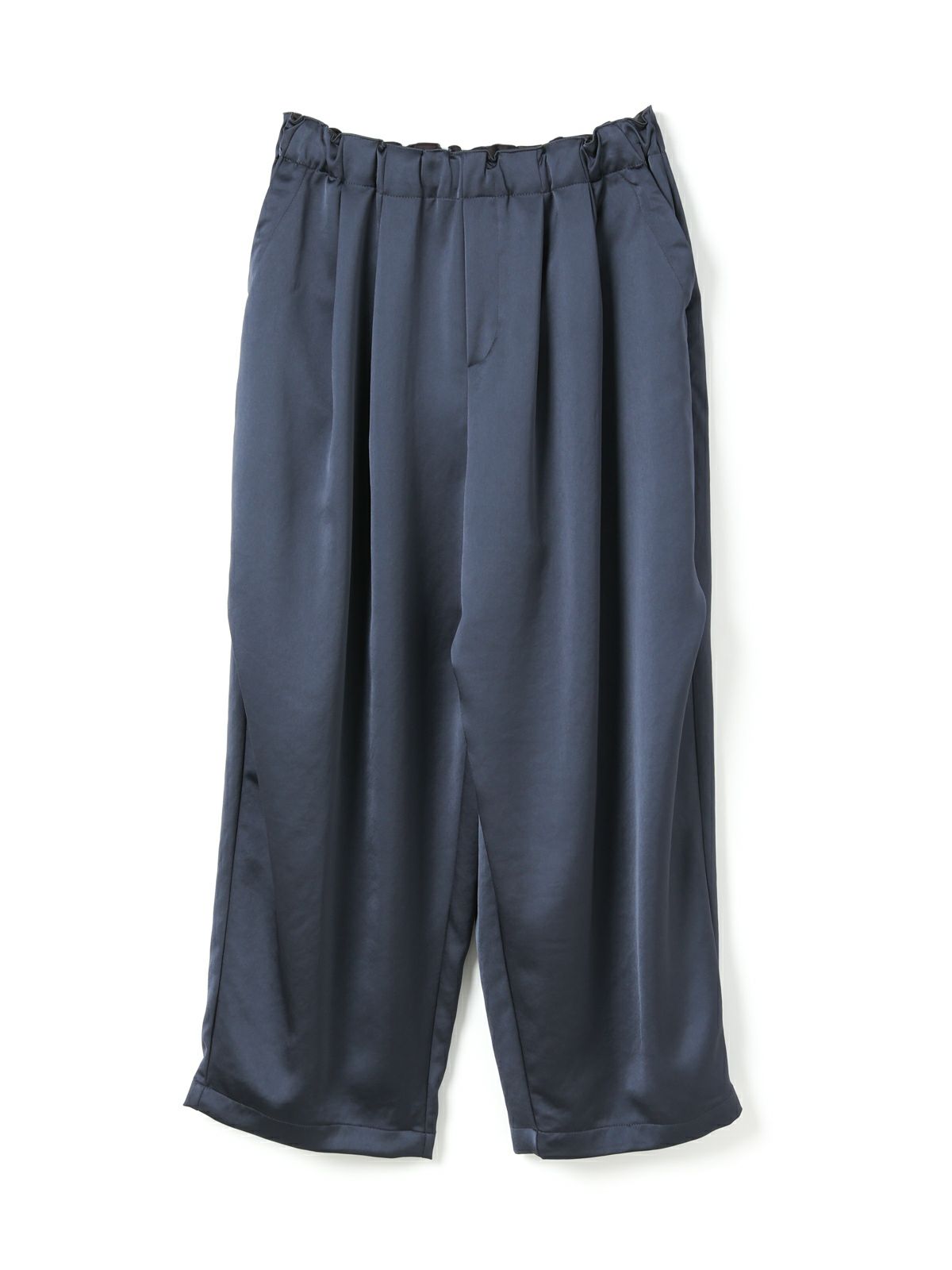 タックが、空気を含んだように立体的なシルエットを演出するイージーパンツ。ウエストはゴム仕様でリラックスした穿き心地ながら、タックの美しいドレープ感できちんとした印象に仕上がります。8分丈で抜け感のあるスタイルもこれからの季節にぴったり。