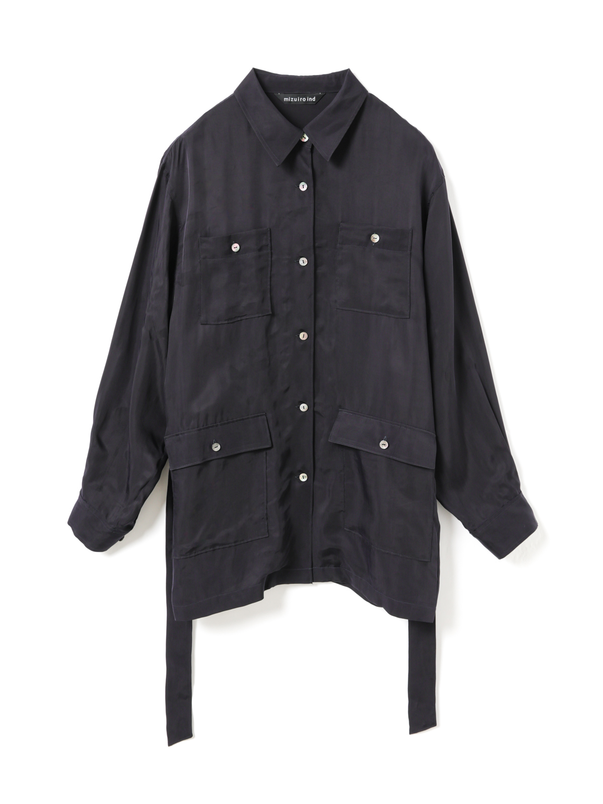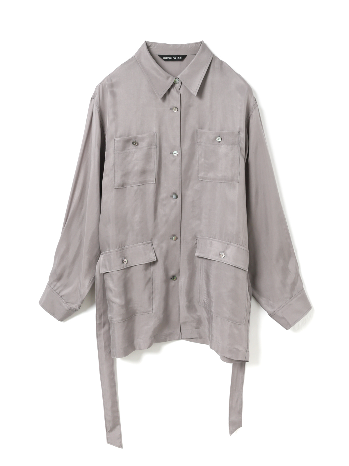 キュプラ素材が生み出す、滑らかな光沢感と軽やかなドレープが特徴のシャツジャケット。フィールドジャケットのディテールをシャツコートに落とし込んだ、mizuiro indらしく新鮮な一着。初夏の羽織りとして活躍します。